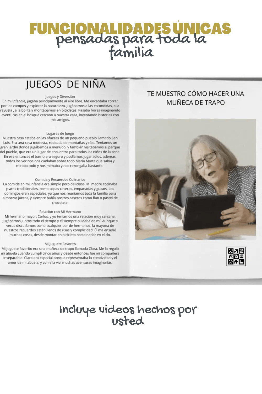 Preserva momentos y recuerdos significativos en un hermoso libro de memorias. Comparte esta experiencia con tus seres queridos y descubre historias que nunca antes habías escuchado.